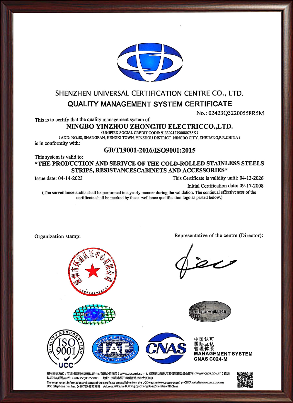 ISO质量管理体系认证证书